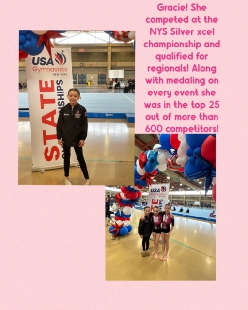 Gracie! She competed at the NYS Silver Xcel championship and qualified for regionals! Along iwth medaling on every event she was in the top 25 out of more than 600 competitors!