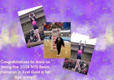 Congratulations Valentina on making the NYS Regional All Star Team and being the 2024 NYS Beam Champion in Xcel Silver in her age division! 1st place!